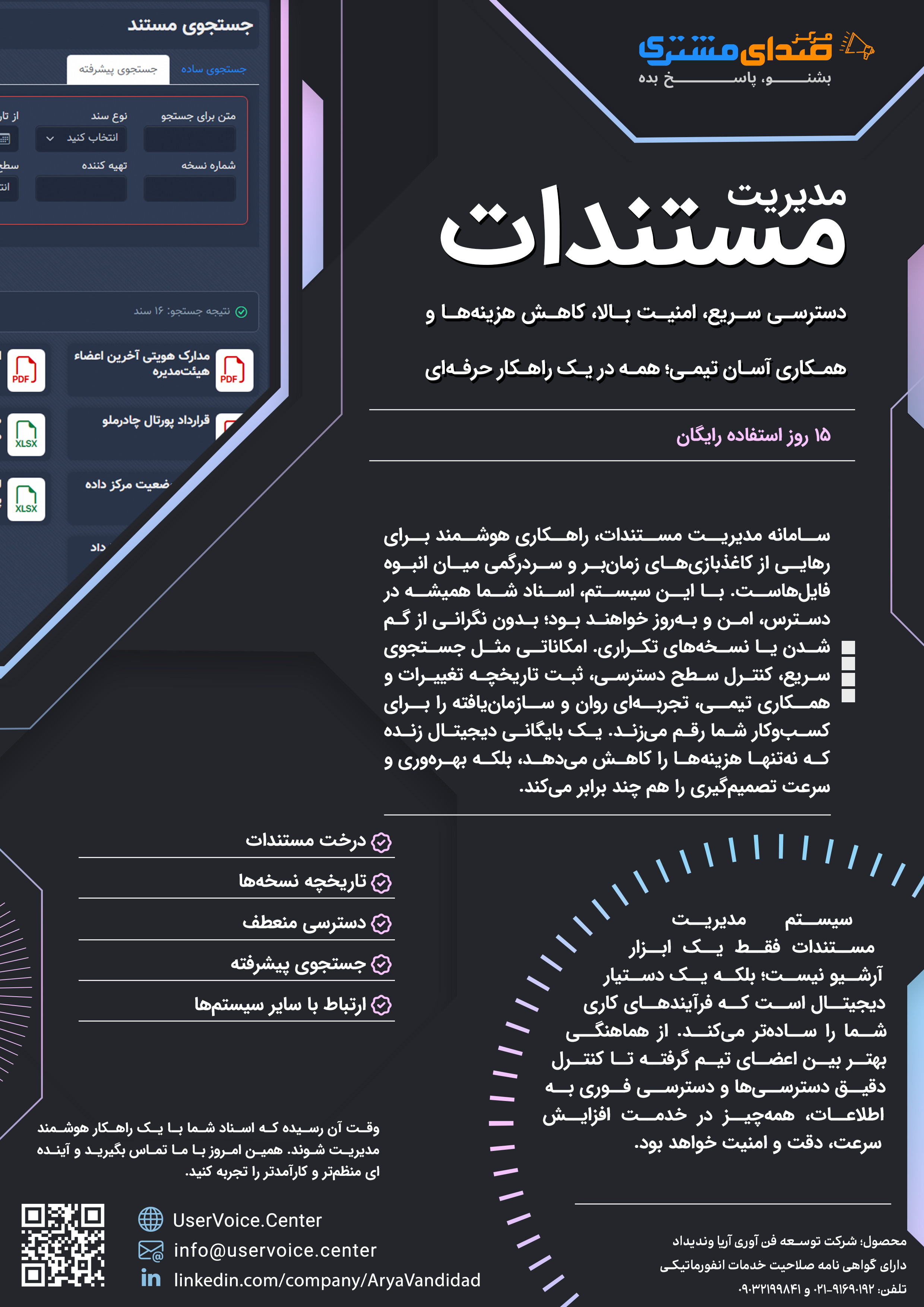 سیستممدیریت مستندات سامانه مدیریت مستندات، راهکاری هوشمند برای رهایی از کاغذبازیهای زمانبر و سردرگمی میان انبوه فایلهاست. با این سیستم، اسناد شما همیشه در دسترس، امن و بهروز خواهند بود؛ بدون نگرانی از گمشدن یا نسخههای تکراری. امکاناتی مثل جستجوی سریع، کنترل سطح دسترسی، ثبت تاریخچه تغییرات و همکاری تیمی، تجربهای روان و سازمانیافته را برای کسبوکار شما رقم میزند. یک بایگانی دیجیتال زنده که نهتنها هزینهها را کاهش میدهد، بلکه بهرهوری و سرعت تصمیمگیری را هم چند برابر میکند. ما کمک میکنیم؛ مستندات خود را نسخهبندی و بایگانی نمایید با نگهداری نسخههای متعدد یک مستند، سابقه و تاریخچه تغییرات یک سند را نگهداری نمایید. مشخص نمایید چه کسی به آن دسترسی داشته باشد. با سیستم مدیریت مستندات، همیشه اطلاعات لازم در دسترس پرسنل سازمان خواهد بود. چرا مدیریت مستندات؟ نگهداری نسخههای متعدد یک سند که در سازمان تولید میشود همیشه یک کار فردی بوده و در صورتی که یکی از پرسنل سازمان این موضوع را شخصا مدیریت ننماید، تاریخچه تغییرات سند وجود نخواهد داشت. همچنین گاهی با خروج یک پرسنل از سازمان تمامی اسناد تولید شده توسط ایشان از بین رفته و خسارج جبران ناپذیری برای سازمان خواهد داشت. سیستم مدیریت مستندات علاوه بر رفع مشکلات ذکر شده، کمک میکند؛ مستندات لازم برای افرادی که نیازمند اطلاعات هستند همیشه در دسترس قرار داشته باشد. قابلیتها و ویژگی های سیستم مدیریت مستندات درخت مستندات با ایجاد یک ساختار درختی از مستنداتی که در سازمان وجود دارد، میتوانید مدیریت مناسبی روی اطلاعات و دسترسی پرسنل سازمان خود ایجاد نمایید. تاریخچه نسخه با نگهداری فایلهای سند تولید شده در هر زمان میتوانید تاریخچه کامل تغییرات یک سند را حذف نمایید. دسترسی منعطف به ازای هر کاربر و هر سند یا شاخهای از درخت مستندات میتوانید دسترسی مدیر، ویرایش کننده، مشاهده کننده ایجاد نمایید. جستجوی پیشرفته امکان جستجو میان تمامی سندهایی که یک کاربر در کل درخت مستندات به آن دسترسی دارد، باعث افزایش سرعت دسترسی کاربران به مستندات موردنیازشان را فراهم مینماید. مزایای استفاده از سیستم مدیریت مستندات دسترسی سریعتر: جستجوی سریع و بازیابی آسان اسناد. کاهش هزینهها: حذف کاغذبازی و کاهش هزینههای نگهداری فیزیکی. افزایش امنیت: کنترل دسترسی، سطحبندی کاربران و ثبت تاریخچه تغییرات. همکاری بهتر تیمی: امکان ویرایش، اشتراکگذاری و کار گروهی روی یک سند. نسخهبندی خودکار: نگهداری نسخههای مختلف اسناد و جلوگیری از گمشدن تغییرات. رعایت قوانین و استانداردها: کمک به انطباق با الزامات حقوقی و مقرراتی. پشتیبانگیری و بازیابی: محافظت از اسناد در برابر حذف یا خرابی. افزایش بهرهوری: صرفهجویی در زمان و تمرکز بیشتر بر کارهای اصلی. کاهش ریسک خطا: جلوگیری از اسناد تکراری یا از دست رفتن اطلاعات مهم. چرا مدیریت مستندات از مرکز صدای مشتری انتخاب هوشمندانه ای است؟ یکی از مهمترین کاربردهای سیستم مدیریت مستندات، علاوه بر ضبط و نگهداری مستندات سازمانی، دسترسی آن در زمان مورد نیاز است. ارتباط سیستم مدیریت مستندات در سامانه مرکز صدای مشتری، کمک میکند، بتوانید مستندات لازم برای پاسخگویی تیکتهای دریافتی را برای کاربران پشتیبان خود در دسترس قرار دهید. همچین میتوانید برای انجام یک وظیفه در سیستم مدیریت وظایف، مستندات لازم برای اجرای وظیفه را نیز به وظیفه الصاق نمایید. این امر از تولید و تکثیر مستندات و تعدد نسخههای در دسترس کاربران جلوگیری مینماید. همیشه مطمن خواهید بود، اسناد مورد نیاز کارشناسان در اختیارشان بوده و همیشه به آخرین نسخه دسترسی خواهند داشت. امکانات سیستم مدیریت مستندات ایجاد ساختار درختی برای مستندات سازمان کنترل دسترسی کاربران در ساختار درخت مستندات سازمان تعیین مجوز دسترسی به شاخه ای از درخت تا یک مستند نمایش کارد و دیالوگ اطلاعات یک سند در صفحه اسناد من امکان 